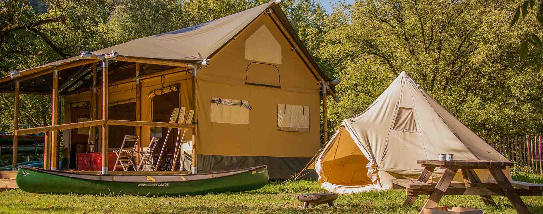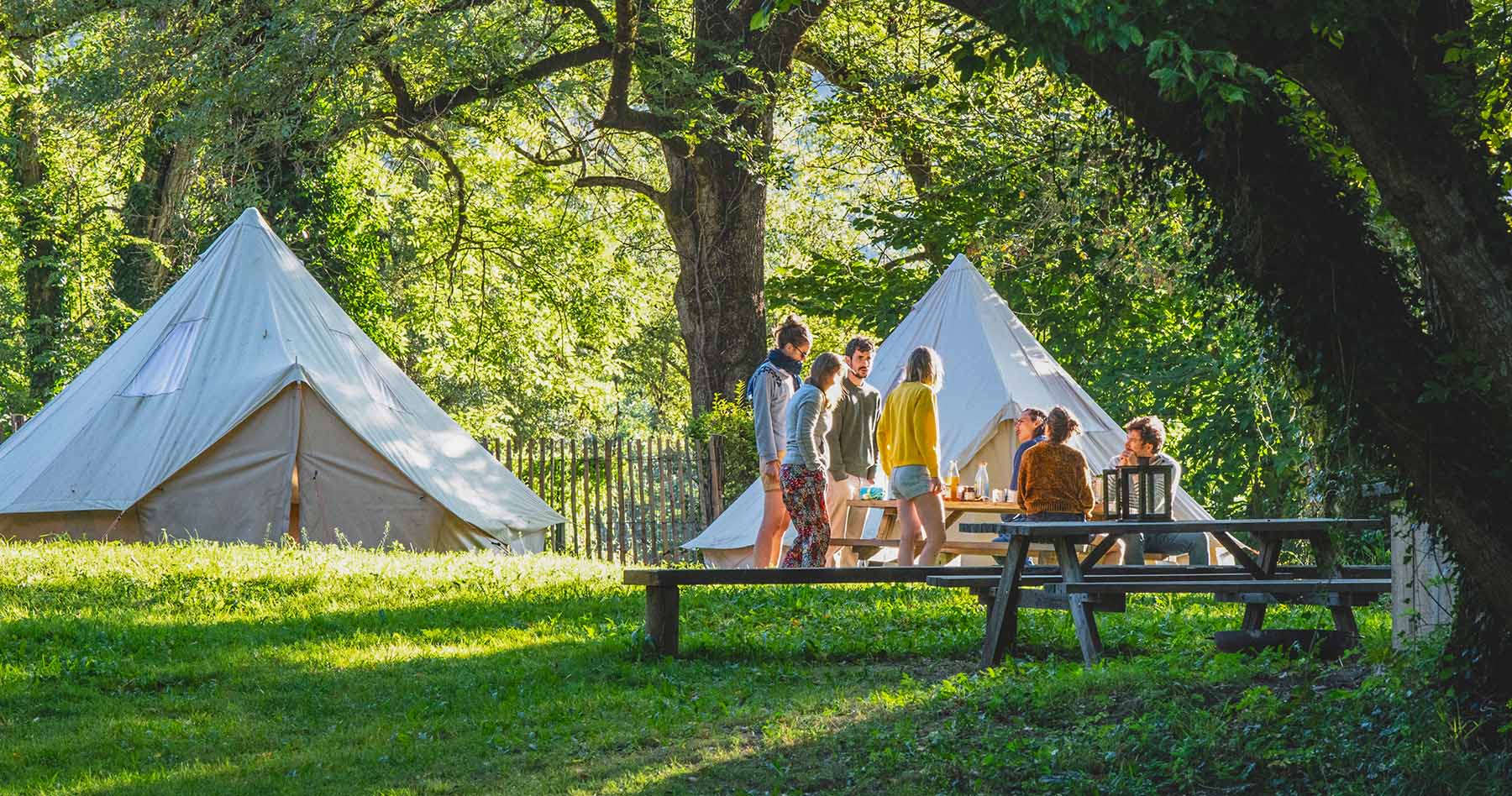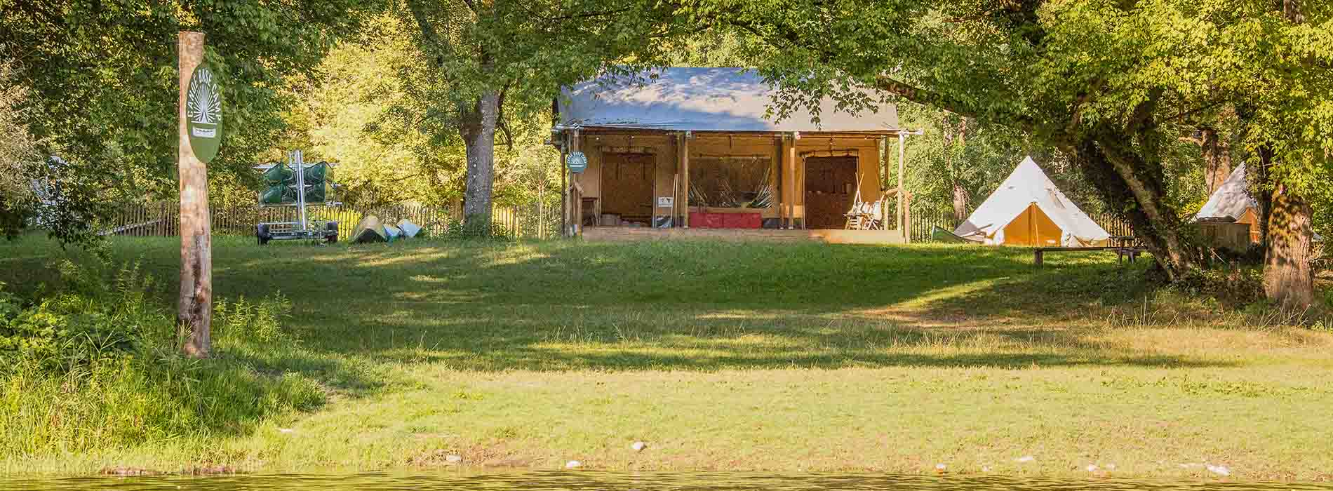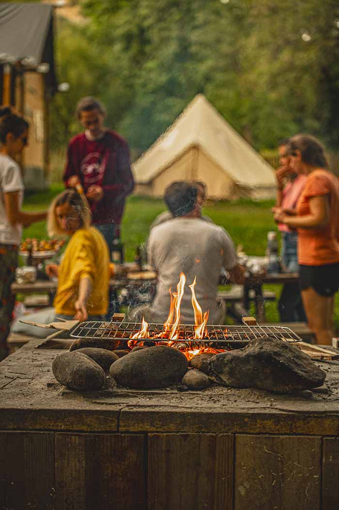 Une grande tente lodge pour vous accueillir, des braseros, un barbecue, quelques tentes-
